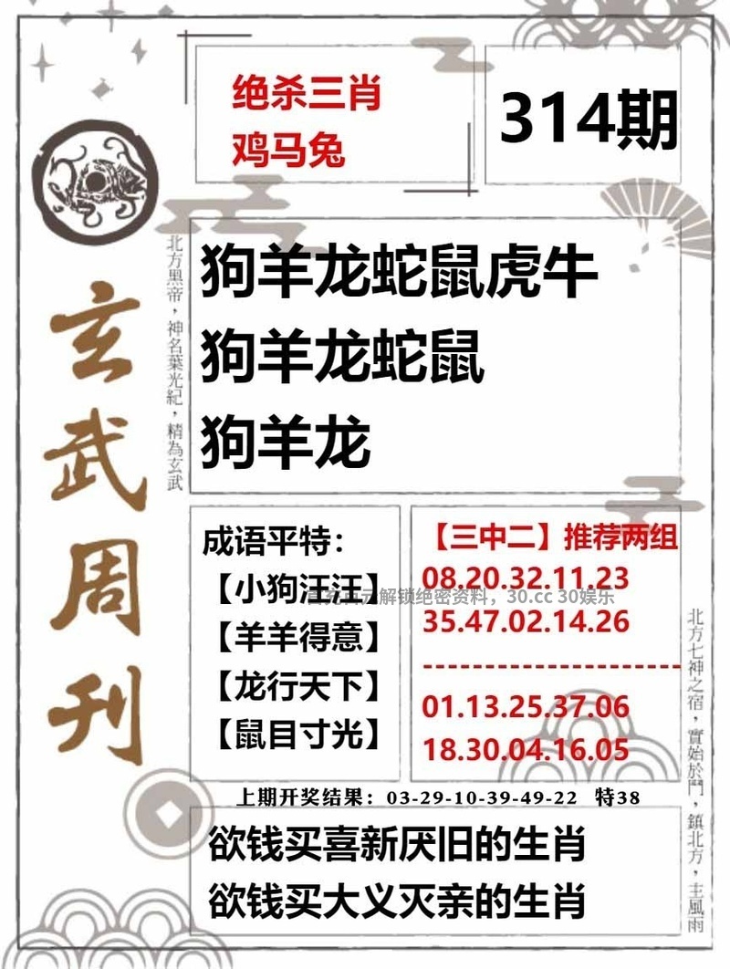 314期:九肖【鸡鼠牛蛇猪龙猴狗】开:羊23中
